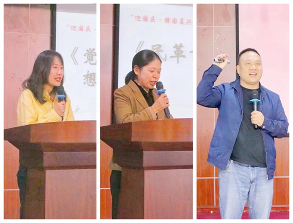 在读书分享环节,阜阳民革党员王超然以《觉醒年代:阅读中的思想启迪与教育使命》为题,深入探讨百年前先进知识分子的思想觉醒对当代教育的启示;民革阜阳一中支部主委马乐英分享《民革前辈与新中国》中的节选故事,生动讲述了民革前辈朱蕴山在国家内忧外患之际,坚守爱国初心、坚定跟随中国共产党、投身民族解放事业的奋斗历程。特邀嘉宾、安徽省政协委员、阜阳市新联会副会长赵飞以《一条大河的文化滋养》为题,将淮河文化的包容坚韧、“王家坝精神”的顾全大局与统一战线成员的使命担当相联系,深刻阐释了文化自信与民族复兴的内在关联。