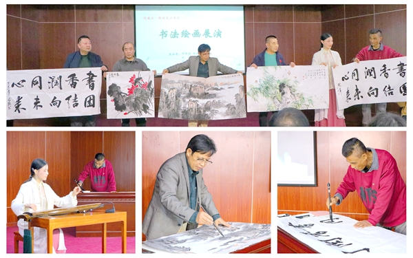 民革阜阳市一中支部拟发展党员冯彬朗诵欧阳修经典词作《采桑子》与现代诗歌《书页里的光》,传统文脉与当代精神在声韵中实现深度交融。阜阳市政协委员、市古琴协会会长张丽茹倾情演奏经典曲目《月舞》。悠扬婉转的古筝旋律萦绕全场的同时,倪伟、史捷、邓平原、张翰东、巩颍波等阜阳民革党员、阜阳中山画院书画家,现场创作书画作品。两者结合,将中华传统艺术的雅致意境转化为生动可感的视觉盛宴。阜阳民革党员徐蒙蒙表演的中国武术刚劲有力、行云流水,传递出青年统战成员的蓬勃朝气,赢得现场阵阵掌声。