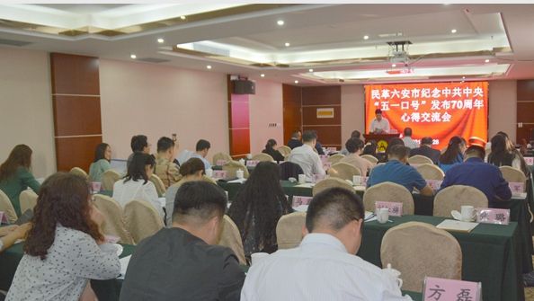 4月28日,民革六安市委会召开纪念中共中央“五一口号”发布70周年心得交流会。民革六安市委会领导班子、各支部支委、各专委会主任和市委会机关全体成员等60余人参加会议。